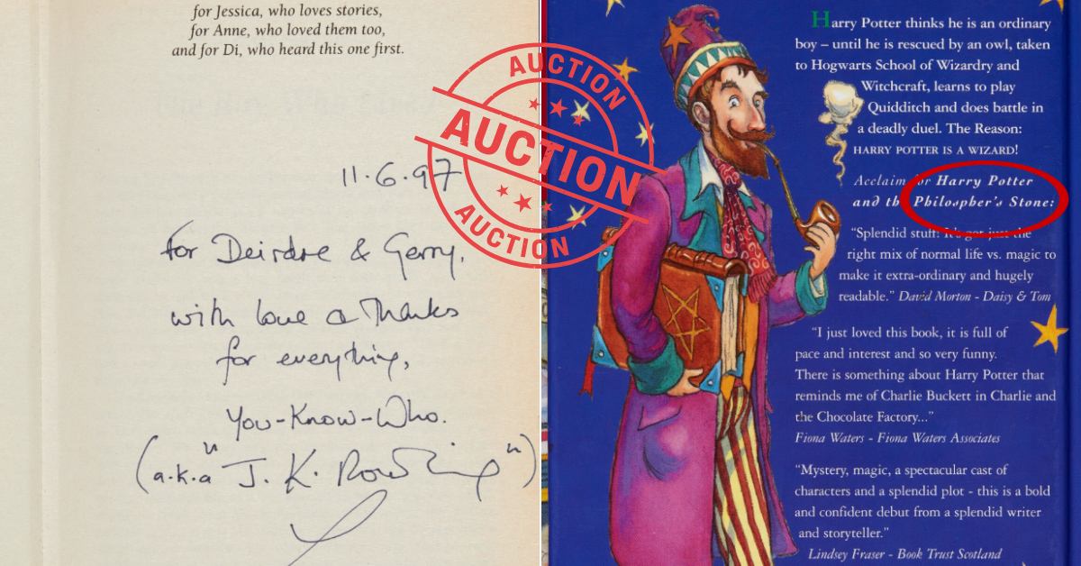 نسخهای که اکنون در حراج سوتبیز عرضه میشود، حتی از این شمار اندک نیز کمیابتر است؛ زیرا پیش از انتشار رسمی چاپ شده و رولینگ آن را در ۱۱ ژوئن ۱۹۹۷ (۲۱ خرداد ۱۳۷۶) به دوست صمیمیاش دیردر هدیه داده است. یادداشت دستنویس نویسنده در صفحه آغازین، که با امضای طنزآمیز «اسمش رو نبر» همراه است، ارزش نسخه را بیش از پیش بالا میبرد.