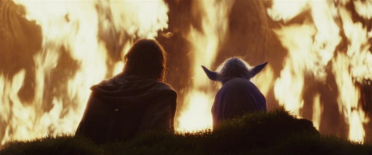 ظهور یودا در قالب روح نیرو (Force Spirit) برخلاف انتظار، با نصیحتهای آرامشبخش همراه نیست. او خود آتش را میافکند؛ کاری که لوک از انجامش ناتوان بود. این صحنه، از نظر احساسی سنگین است: استادِ دوران قدیم، همان کسی است که پایان آن دوران را رسمیت میبخشد.